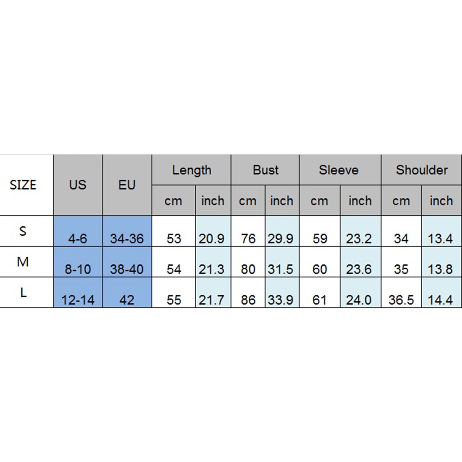 M Length: 21.26 Bust: 31.5 Sleeve: 23.62 Shoulder: 13.78