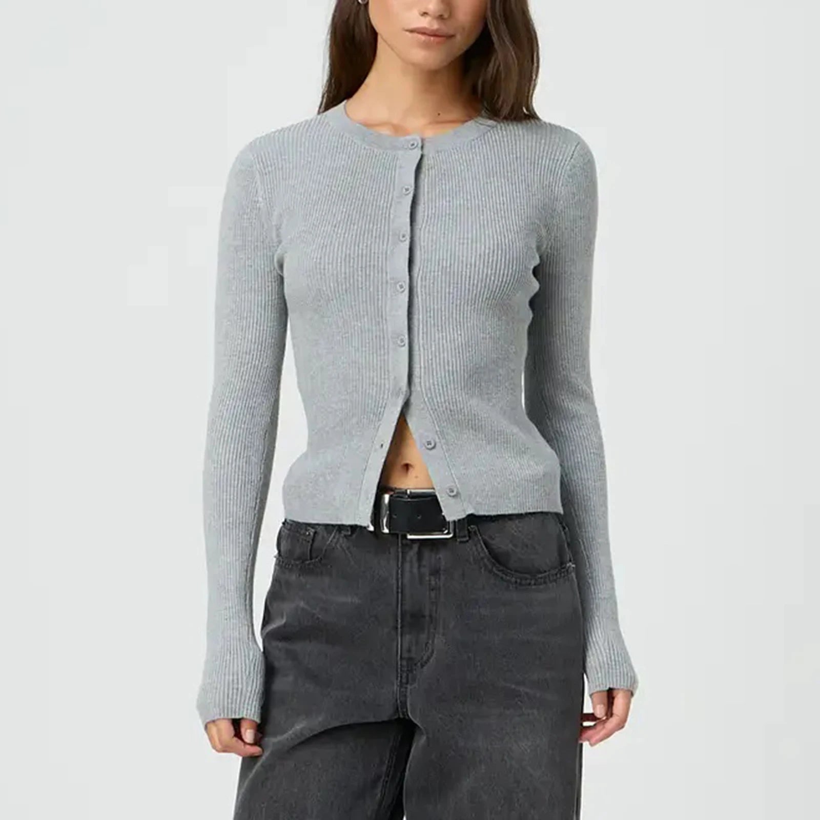 Women's Autumn Sweater Cardigan Solid Color Long Sleeve Round Neck Button Up Ribbed Knitwear